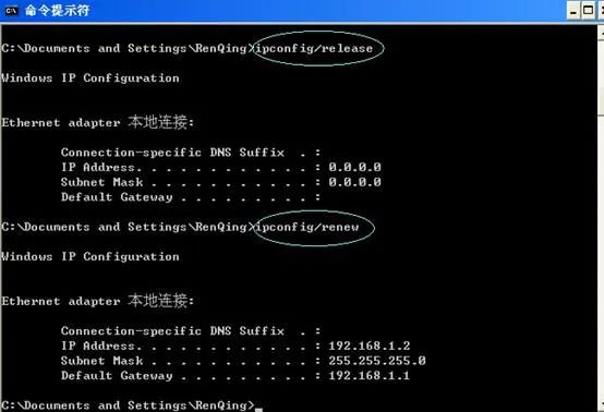 了解了光猫地址与路由器地址相同造成的冲突,我们选择只有将路由器复位后就只与其电脑连接,二不要再连接到光猫。接着再使用两个DOS命令ipconfig/release及ipconfig/renew将电脑的IP信息刷新: